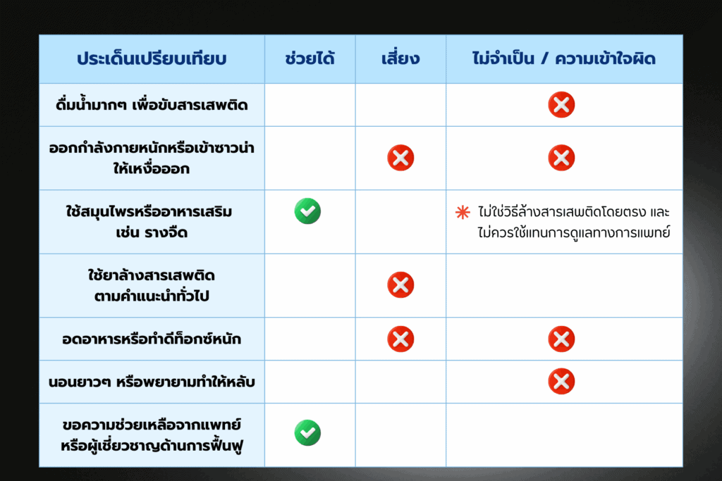 อีกประเด็นที่มักถูกมองข้าม คือการใช้วิธีแก้อาการเมายาหรือแก้อาการดีด โดยหวังให้หายเร็ว เช่น การใช้ยานอนหลับ ยากล่อมประสาท B5 หรือแม้แต่แอลกอฮอล์เพื่อกดอาการ วิธีนี้ไม่เพียงไม่ช่วยให้ร่างกายล้างสารเสพติดได้จริง แต่ยังเพิ่มความเสี่ยงต่อการเสพติดซ้ำซ้อน และอาจนำไปสู่ภาวะฉุกเฉิน เช่น การกดการหายใจหรือหมดสติ